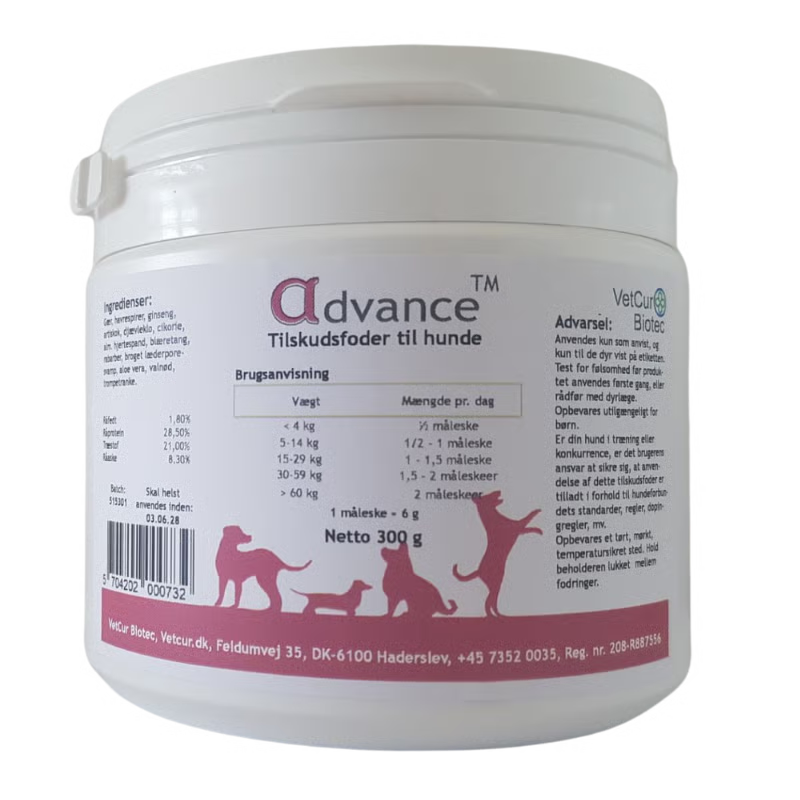Advance kan anvendes som supplement til den daglige kost og er velegnet til hunde, der kommer sig efter sygdom, perioder med lav appetit eller blot har brug for lidt ekstra støtte til kroppen.